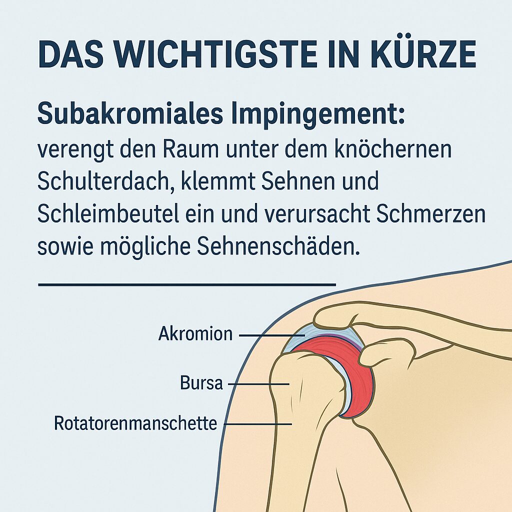 - Subakromiales Impingement: verengt den Raum unter dem knöchernen Schulterdach, klemmt Sehnen und Schleimbeutel ein und verursacht Schmerzen sowie mögliche Sehnenschäden.